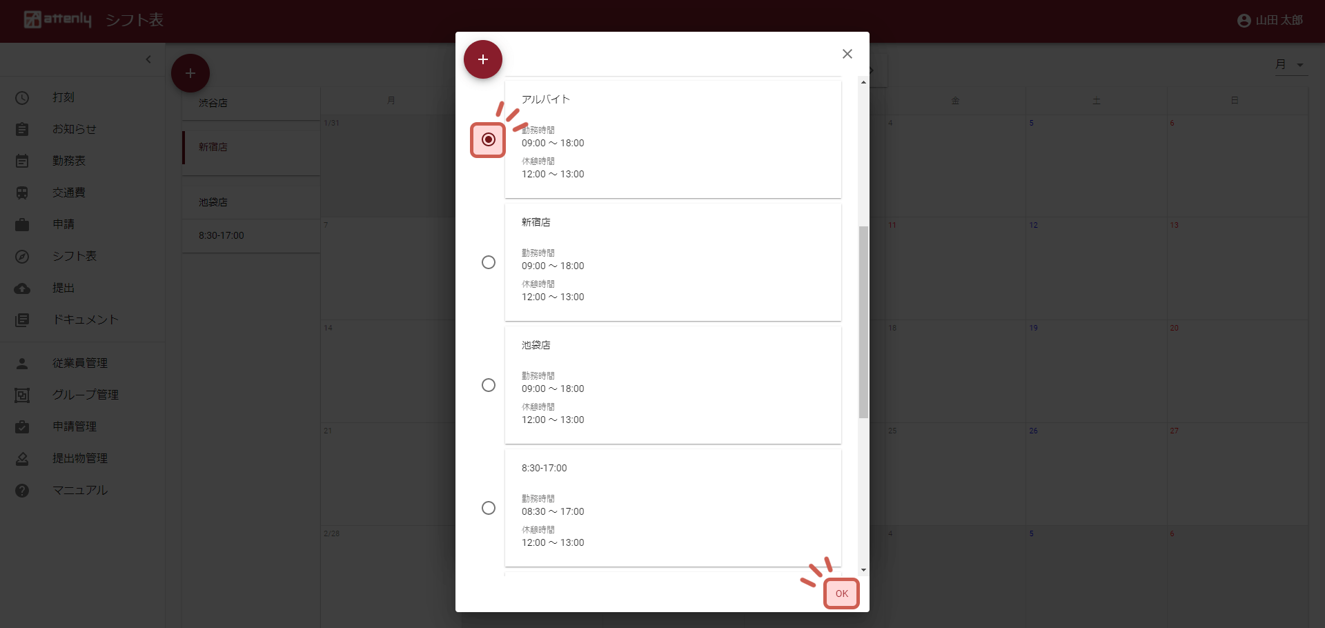 表示されるシフトの中から修正するシフトをクリックします。