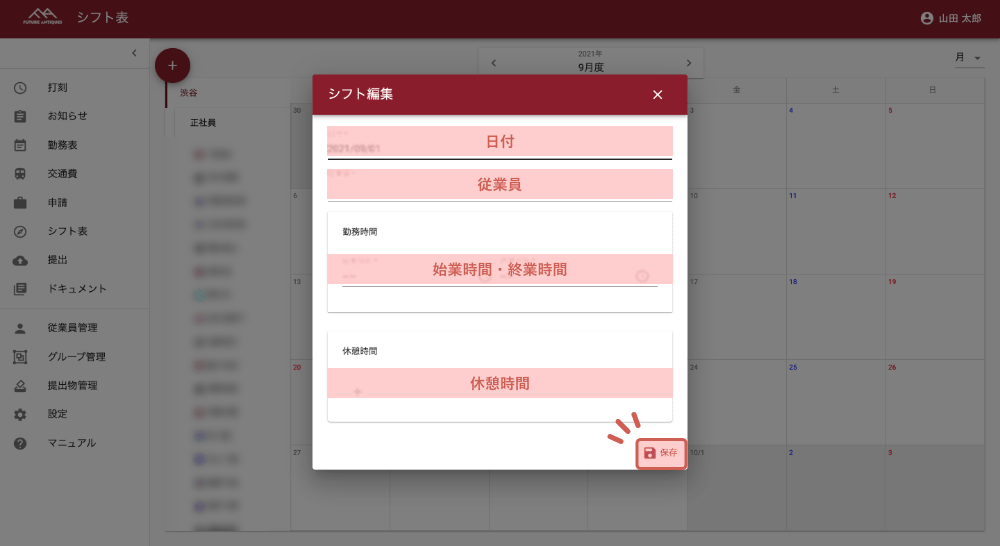 入力が完了したら「保存」をクリックします。シフト修正・削除