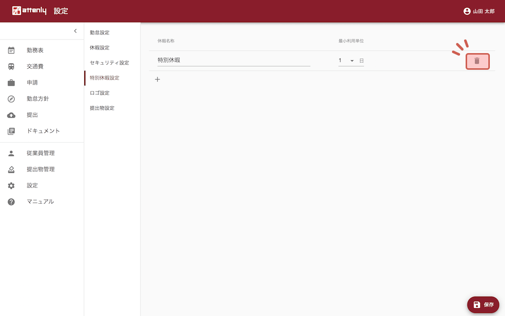 対象の休暇の最小利用単位の横にある「ゴミ箱アイコン」をクリックし、「保存」をクリックします。