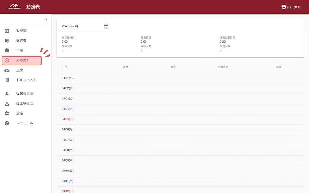 シフト制であれば(メニューに「シフト表」がある場合)「勤怠方針」メニューは表示されず、設定は不要です。