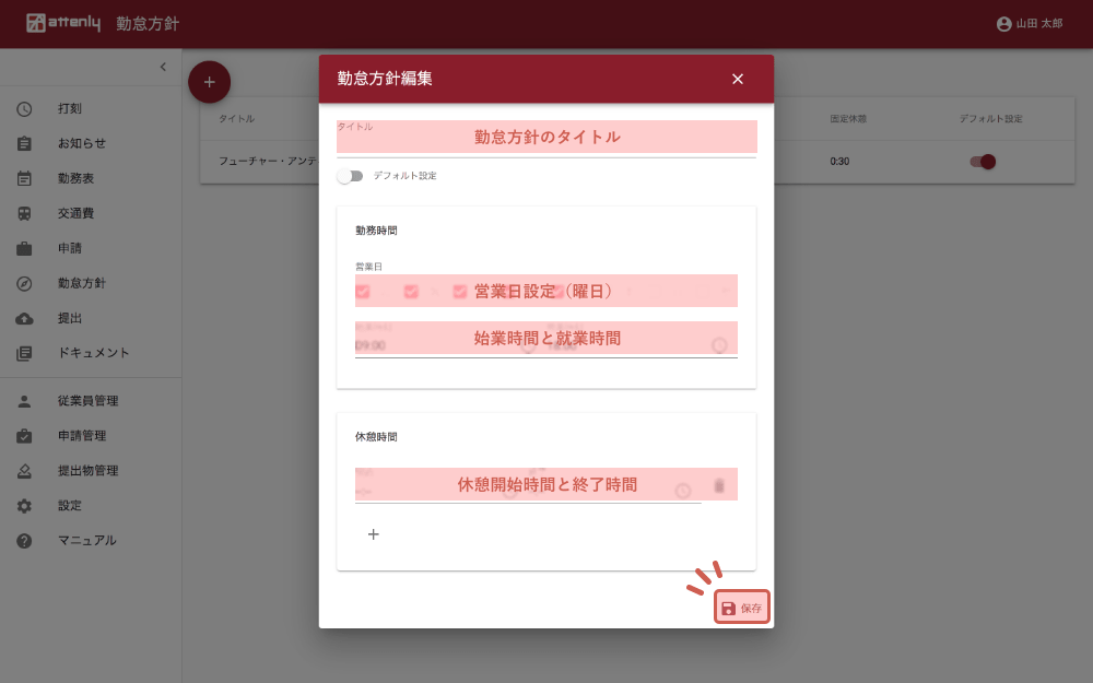 表示ダイアログに沿って「タイトル」「営業日」「始業・終業時間」「休憩開始・終了時間」を入力します。情報の保存