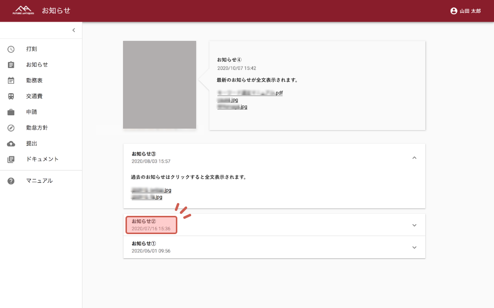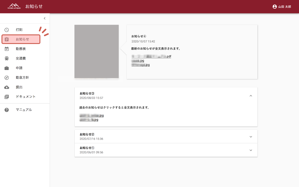 「お知らせ」メニューは社内掲示板のような役割をしています。お知らせページは最新のものが全文、更新されると古いお知らせは下部にタイトルのみ表示(タイトルをクリックすると全文表示)されます。
