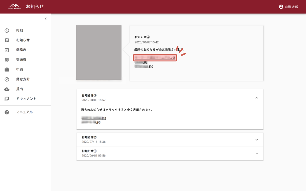 管理者側で、お知らせメニューを追加している場合、閲覧やダウンロードが可能です。左のメニューバーより「お知らせ」をクリックします。