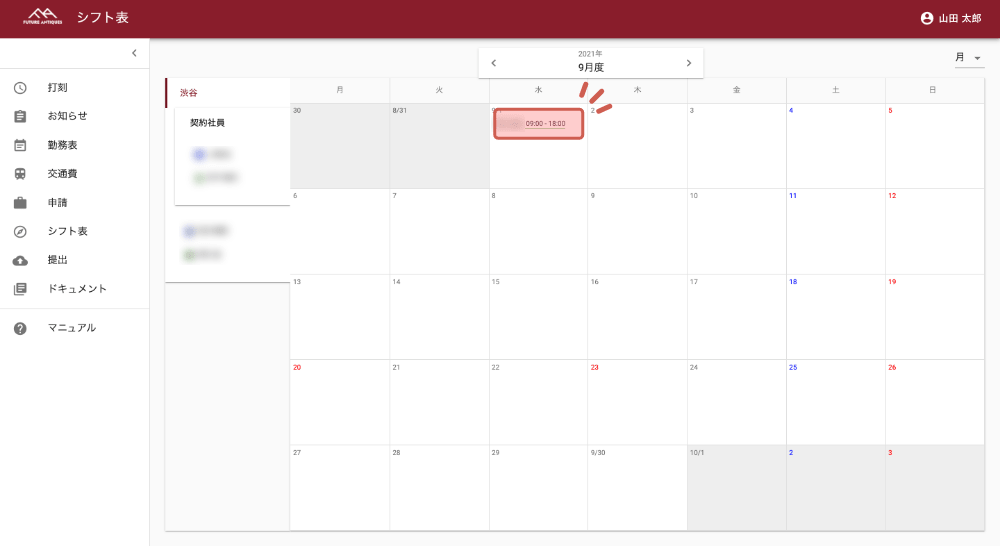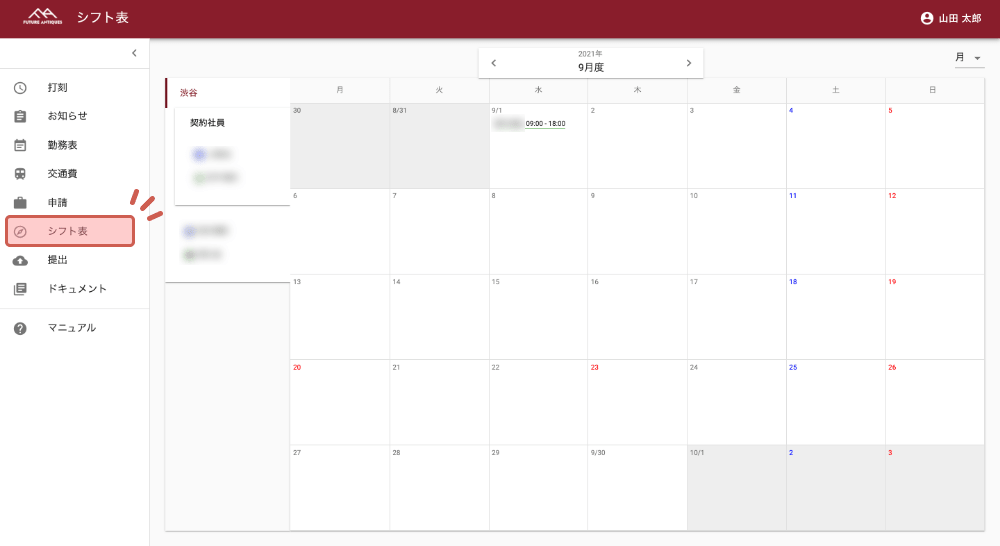 左のメニューバーより「シフト表」をクリックします。するとシフト表が表示されます。自身をはじめ所属グループ(部署や事業所など)のシフトが表示されます。