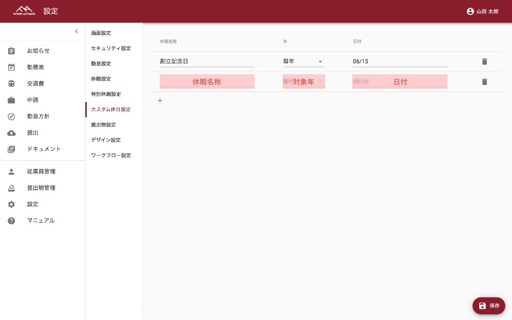 「休暇名称」「対象年」「日付」を入力します。