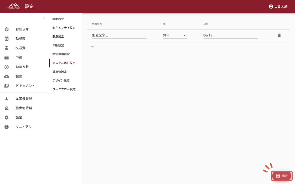 左のメニューバーより「設定」をクリックし、設定一覧の中から「カスタム休日設定」をクリックします。