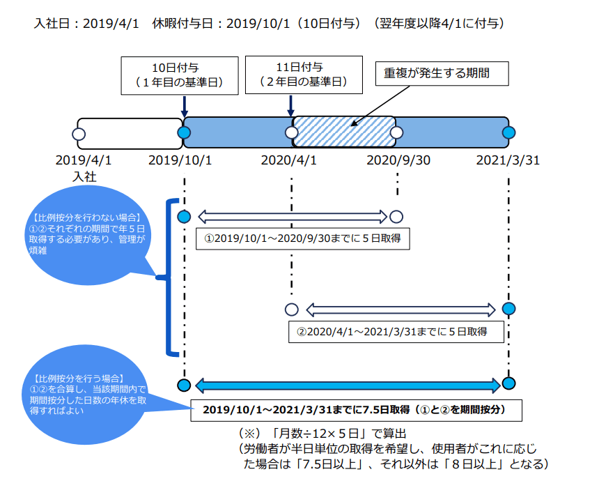 2019/10/1と2020/4/1を基準日としてそれぞれ1年以内に5日の年次有給休暇を取得させる必要がありますが、管理を簡便にするため 2019/10/1(1年目の基準日)から 2021/3/31(2年目の基準日から1年後)までの期間(18か月)に、7.5日(18÷12×5日)以上の年次有給休暇を取得させることも可能です。